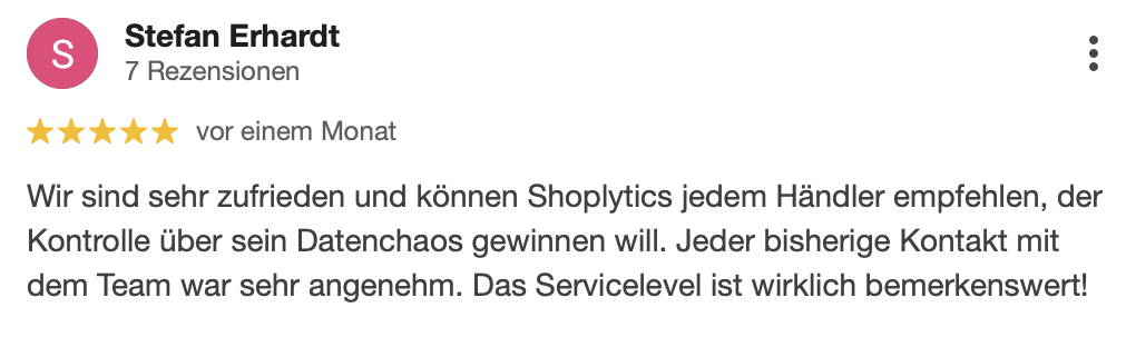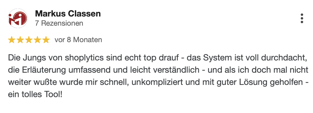 " Ich nutze täglich die Dashboards von Shoplytics. Super übersichtlich und daher super nützlich."