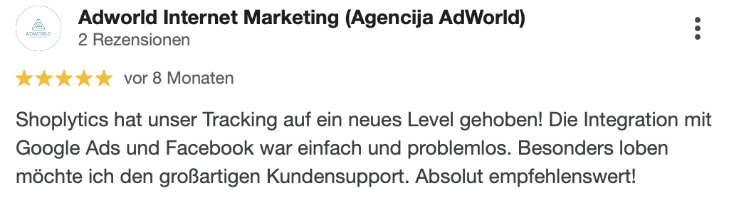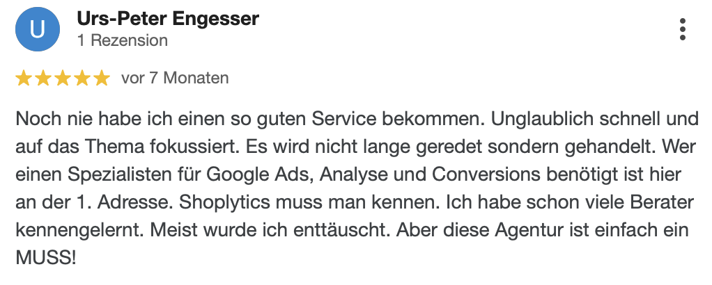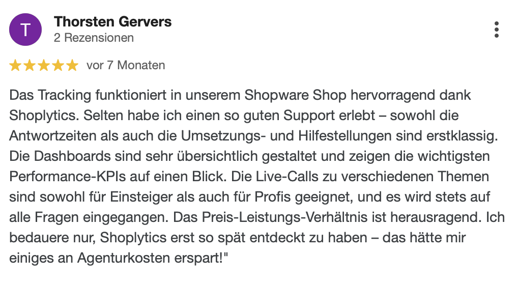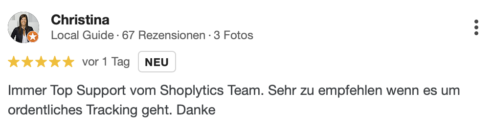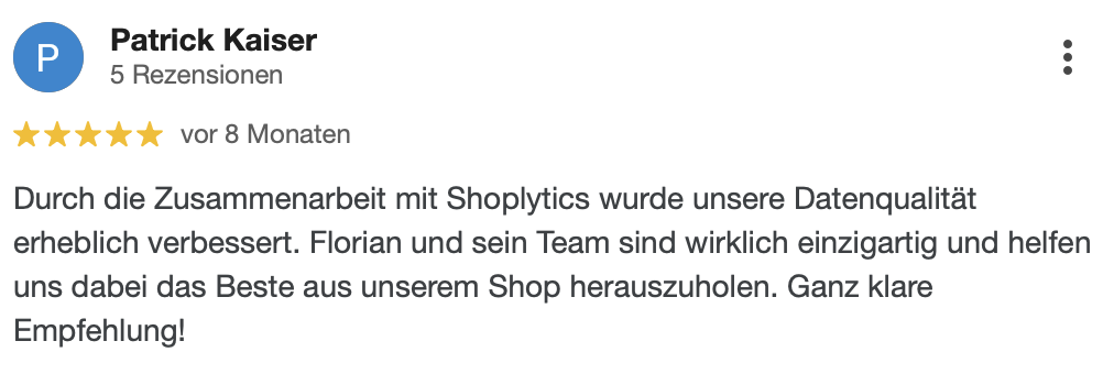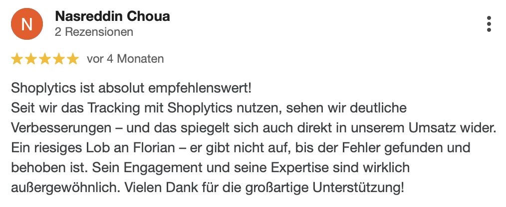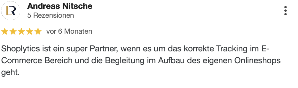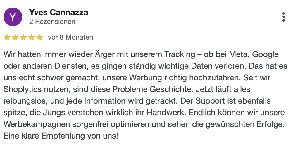 "Seit wir Shoplytics für unser Tracking einsetzen, haben wir deutlich weniger Zeit mit technischen Details verbracht und können uns mehr auf die kreative und strategische Seite unserer Kampagnen konzentrieren. Absolute Empfehlung."